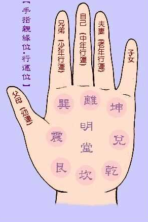 手相有先天、后天之别:本人命运,为后天,少年到老年也;家庭(六亲宫)运则为先天。故先父母,后兄弟,再自己,再妻妾,再子女也。内为先天,外为后天,故先天父兄,后天妻子也。五指为五行所化,为五脏之端,为五志之态。指掌所属,在医学和气功中有广泛的应用。